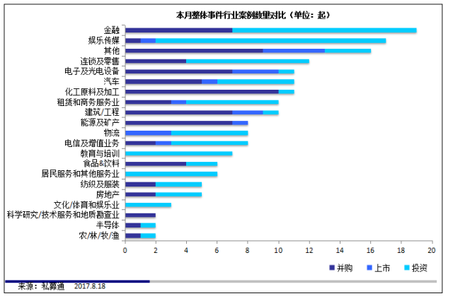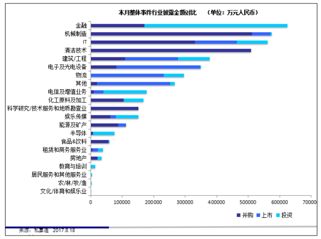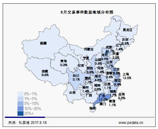 截止本周五下午,投资、上市和并购共107起事件,涉及总金额308.03亿元人民币。从交易金额来看,涉及金额较大的事件是2017年8月12日,新疆城建(集团)股份有限公司成功受让江苏金昇实业股份有限公司、国开金融有限责任公司、赵洪修、常州金布尔投资合伙企业(有限合伙)、江苏华泰战略新兴产业投资基金(有限合伙) 等持有的卓郎智能机械有限公司95%股权,作价97.38亿人民币。从交易事件地域分布看,目前主要分布在北京市、广东省和上海市,占比分别为21.65%,17.66%和12.54%。本周新三板市场共有135家企业挂牌,新增加股本为39.92亿股,本周新三板成交总金额为26.50亿元人民币,目前共有11523家企业挂牌新三板,总股本为6720.72亿股。