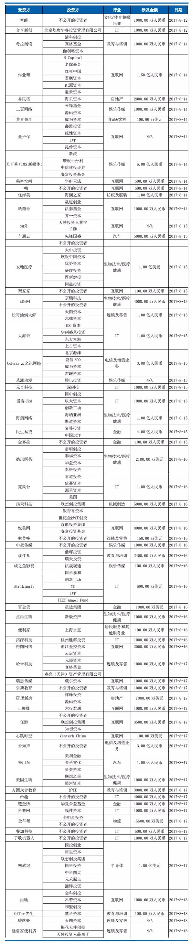 截止本周五下午,共发生63起投资事件,披露投资金额事件58起,共计50.32亿元人民币。本周值得注意的是2017年8月15日,北京大中投资有限公司、软银中国创业投资有限公司、优势资本(私募投资)有限公司、赣州盛虔投资管理有限公司、厚新健投 等投资上海安翰医疗技术有限公司1亿美元。安翰医疗在2014年1月成立,是一家致力于研制胶囊内镜机器人系统并实现商业化应用的公司。专业从事医疗器械研发、生产、销售及服务。安翰医疗本次所得资金将用于安翰医疗市场版图开拓及新产品线研发。